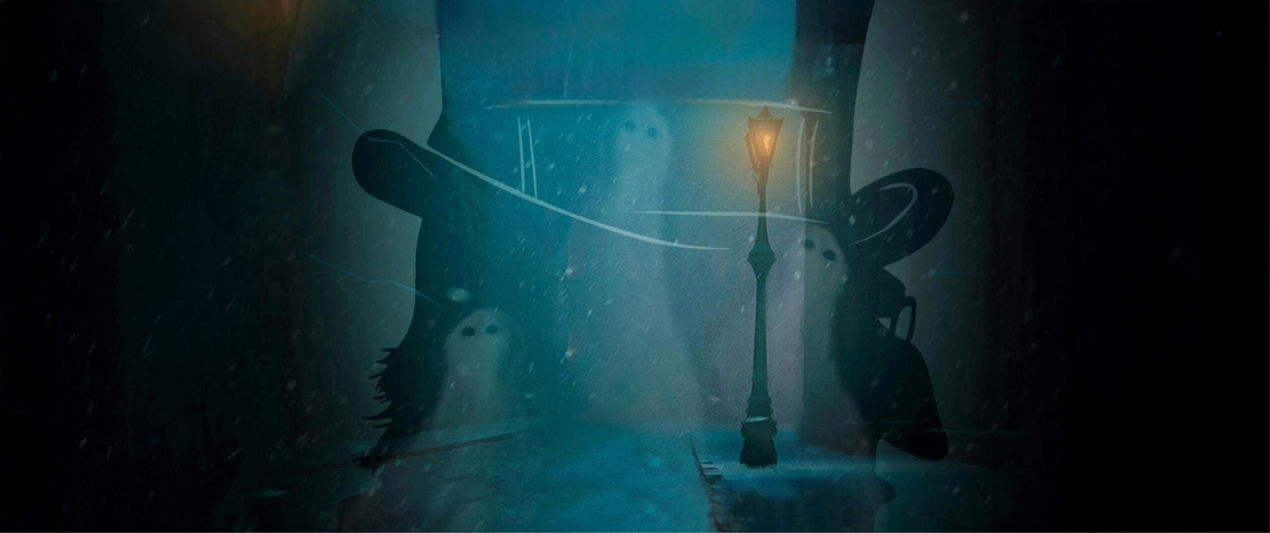 Al llarg de la nit, Scrooge s’enfronta al seu passat amb l’Esperit de les Nadals Passats, veu la crua realitat del present amb l’Esperit dels Nadals Presents i descobreix el destí fosc que l’espera amb l’Esperit dels Nadals Futurs. A través d’aquest viatge, Scrooge aprèn el valor de la bondat, la solidaritat i l’amor.